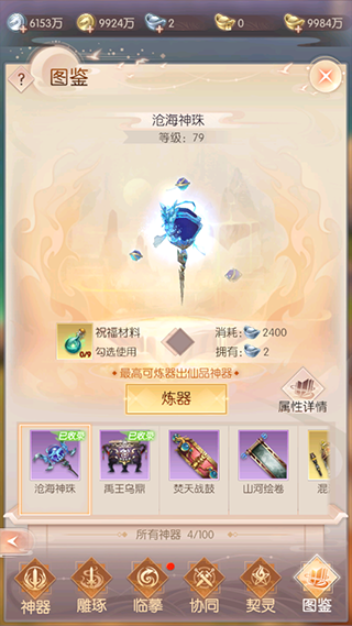 已收录的神器可通过图鉴中的炼器功能打造一个全新的神器,炼器后将获得不同品质的神器,使用祝福材料将提高获得高品质神器的几率