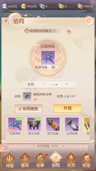 已收录的神器可通过协同提升该类型神器的属性,协同中增加的属性无需装备神器便可生效