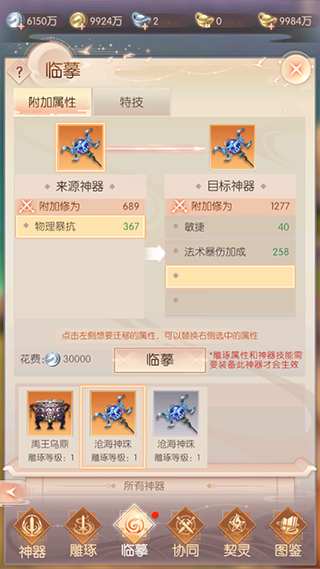 可将神器的附加属性和特技转移到当前装备的神器上,附加属性可从任意类型的神器上临摹,神器特技只能从同类神器中临摹;临摹已拥有的神器特技可提升其等级,获得更强的效果,特技最高等级为5级