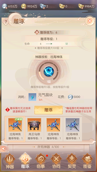 神器可通过雕琢提升雕琢属性加成,雕琢达到一定等级后可提升神器技能效果,雕琢属性需要装备才能生效,且不可继承