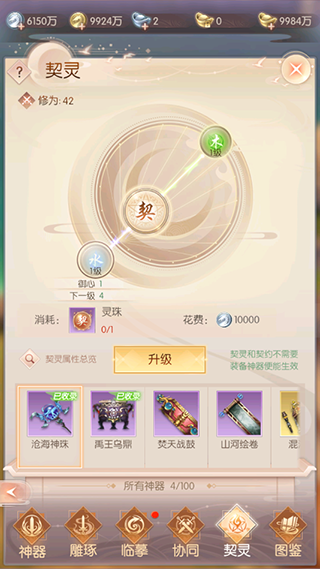 已收录的神器可通过契灵提升该类型神器的属性,契灵属性无需装备神器便可生效