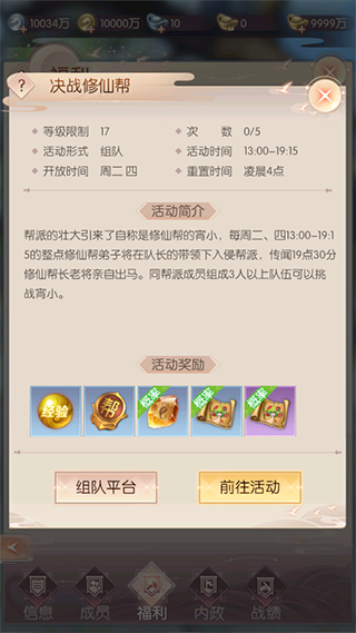 每周二、四13:00-19:30之间的每个整点都有可能有修仙帮宵小入侵帮派基地。