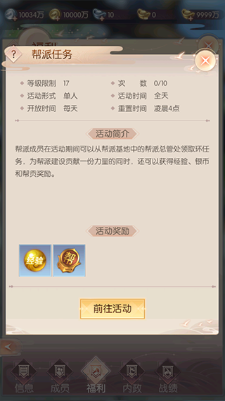 活动期间每天可以完成10次帮派任务。接取帮派任务后,根据帮派总管的吩咐去完成各种任务。任务完成后,可以获得经验、银币和帮贡奖励。帮贡可以在帮派商店购买物品,也可以用来升级修炼等级和生活技能等级。