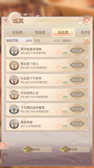 赏善罚恶:进行一定次数的赏善罚恶,或者带队进行一定次数的赏善罚恶,可以获得成就点和银币、称号。