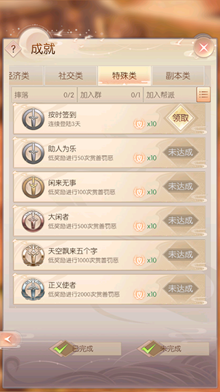 勤能补拙:低奖励进行一定次数的赏善罚恶,或者连续登陆一定天数,可以获得成就点和银币。