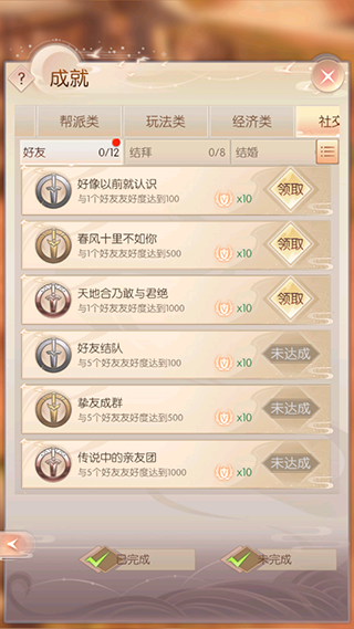 结拜:拥有一个结拜家族,或者在同一个结拜持续一定天数,或者与结拜兄弟好友度达到一定数值,可以获得成就点和银币。