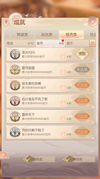 银币:累积获得一定数量的银币,可以获得成就点和银币。