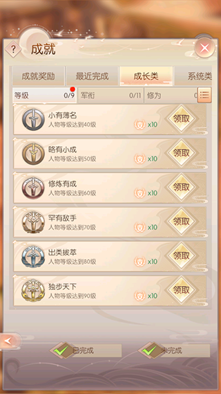 技能:指定数量的技能升到一定等级,可以获得成就点和银币、称号。