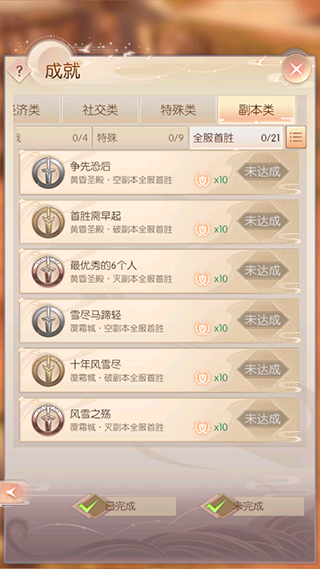 全服首胜:取得指定副本的全服首胜,可以获得成就点和银币。