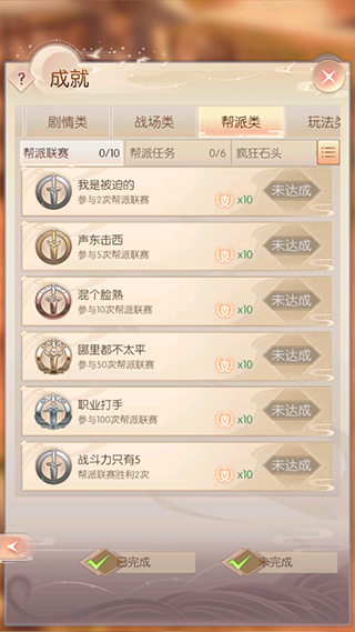 帮派联赛:参加一定次数的帮派联赛,或者取得一定次数的帮派联赛的胜利,可以获得成就点和银币、称号。