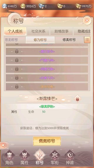 金币:累积获得一定数量的金币,可以获得成就点和称号。