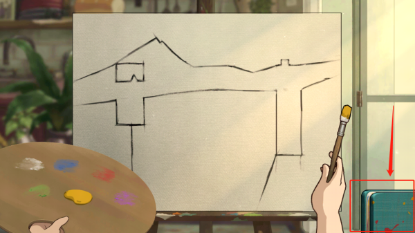 20、点击得到的绿色颜料,再点击画架,用画笔蘸取绿色颜料(点击色板上的绿色颜料即可),将绿色的部分涂满