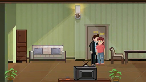 过场动画时,丈夫和妻子看看电影,突然丈夫凭空消失,只剩下伤心的妻子。(注意此时妻子坐在左侧的椅子上)