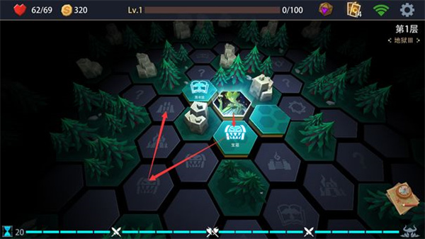 秘境分为3层,每一层你都有20天的时间来探索地图并提升实力,每隔5天会有一名敌人降临,敌人的危险程度随着时间递增。在第20天时,你将会遇到该层的最终BOSS。在探索秘境的过程中,每一步怎么走,卡组怎么构筑,是能不能顺利逃出秘境的关键。步步为营,如履薄冰,你的智慧将带你走得更远。