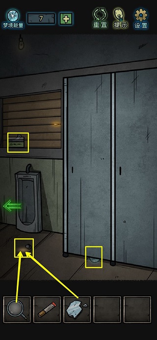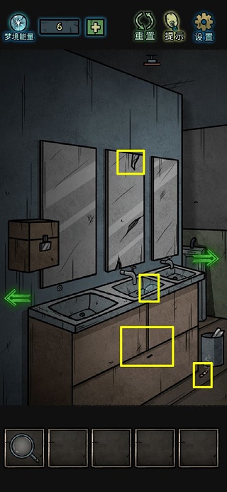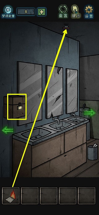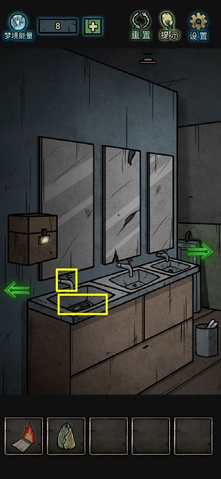 8、镜子上拾取玻璃碎片,洗手台里一个梦境能量;打开没上锁的柜子,获得扳手和半个碎片;