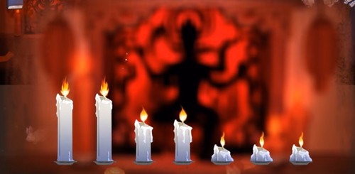 7、窗户上面有蜡烛,根据窗户上面的蜡烛解开神像蜡烛谜题,获得一个半截蜡烛,往右边走,转换场景