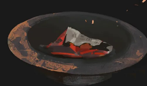 12、把刚刚获得道具全部烧掉,爬上棺材触发剧情,火盆里面有一张纸条,之后进入尾声