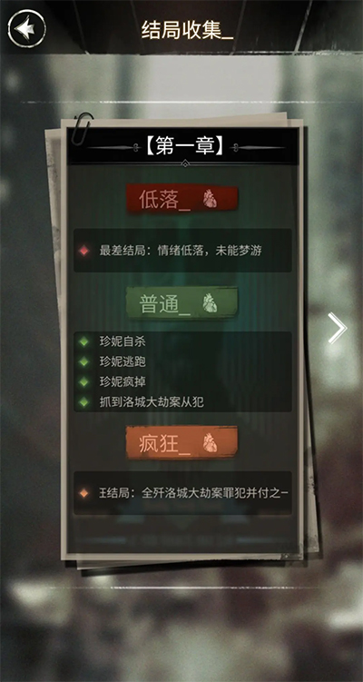 探魇作为一款文字剧情解谜游戏,拥有多元化开放结局,玩家会扮演侦探K,解读剧情文字,做出自己的判断,游戏的玩法非常烧脑,形式新颖,是很值得玩的侦探破案游戏。但游戏里总共有多少个结局呢?那就由小编给大家一一介绍吧!游戏里每个章节的结局根据情绪值来划分的话是共有三种:低落、普通、疯狂。而这三种结局又有不同的开放结局。