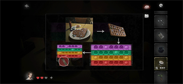进入第一个房间有2个桌子,1个男孩会拿走你的书,第二个桌子有个游戏,线索就在旁边的饼干上,按照凸起点亮珠子,得到1个木块拼图还有个我也不会解的东西(建议看视频吧!)会得到1个钻石糖;