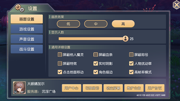 打开游戏右下角的【设置】图标,这里集合了画面、游戏、声音和战斗设置四大项,下面为大家简单介绍一下吧。1、画面设置:
