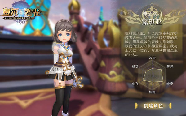 职业:神圣祭司;特色:辅助/回复;上手难度:★★★;神圣祭司为治疗型职业,她在团战中以加血辅助为主,被誉为战场奶妈,是队友们眼中的救世主!她拥有极强的生存能力和恢复能力,在队伍中负责保护队友,掌握战斗局势,适合新手,中级玩家。