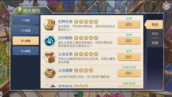 在这个阶段,大家可以优先根据自己的能力完成对应难度的组队副本,获取经验和装备,让自己的能力得到快速提升。21级开放的封印裂隙,也就是传说中的“一条龙”,每天有10次8倍奖励,10次单倍奖励,组队人数越多奖励越丰厚,一定不要错过。升到27级,优先完成公会任务,不仅有经验还有公会贡献度,这也是每天必做的单人玩法。等到21:00,还有当天最后一个,也是每天不能错过的经验玩法——公会盛宴,一边和公会的朋友聊聊天,一边领经验、答题、拿宝箱。小贴士:在做完组队副本后,如果获得了更好的装备记得及时穿上,加持石优先强化武器,会让你做任务的效率更高。