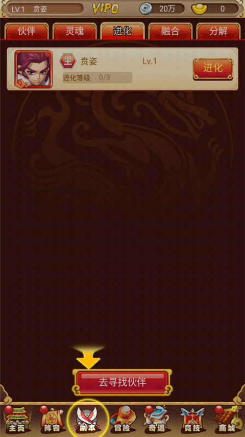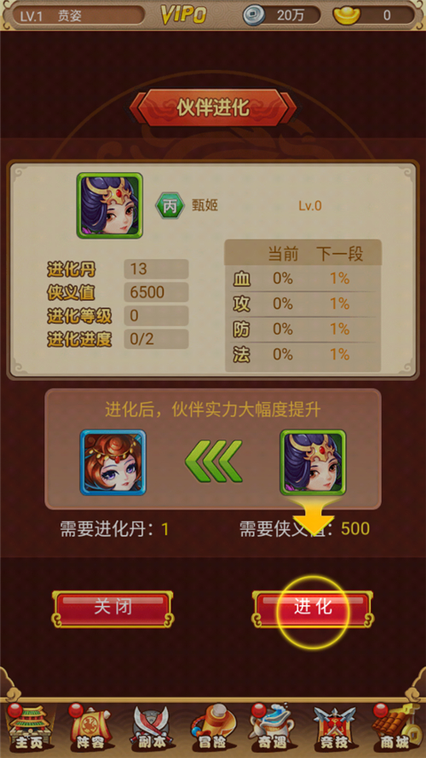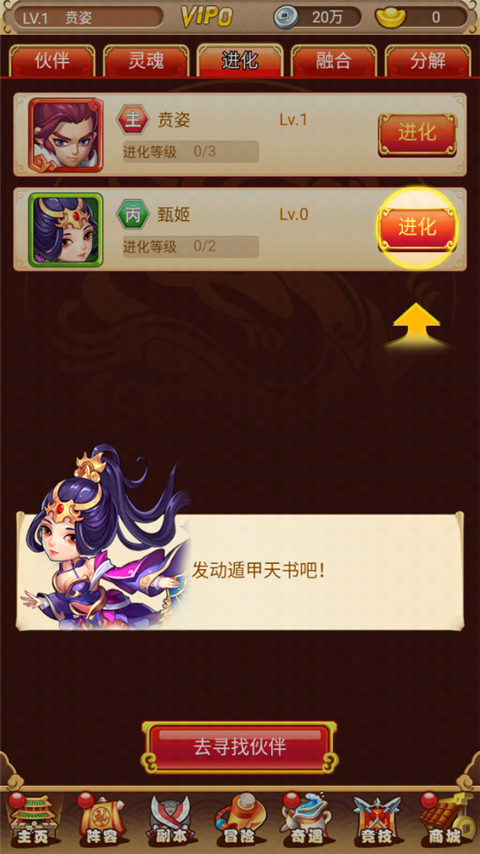 升级到5级,系统赠送蔡琰,点击“伙伴”——“进化”,进化3次后(6个进化丹),蔡琰“变身”为蔡文姬,继续进化9次(60个进化丹),就可变身为神蔡文姬。这英雄和神孙权一样,是第一批被淘汰的神将之一。不过2区也有大神把她搞到满阶+7,每死亡一个队友,攻击力增加80%,很偏门的玩法了,平民不推荐,毕竟资源太稀缺!