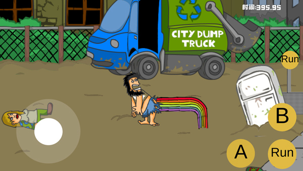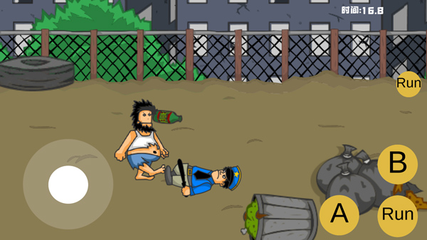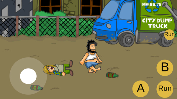 1、打开流浪汉想睡觉手机版,游戏中玩家将扮演一名流浪汉,屏幕左边控制移动,右边则为攻击键、以及奔跑键;