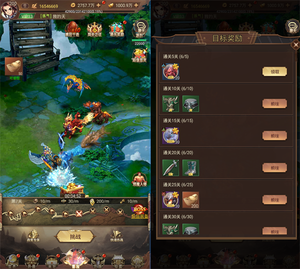 主线挂机贯穿整个游戏,玩家可以通过主线挂机时长获得经验、元宝和游历值,玩家也可通过快速作战提高挂机效率,关卡越高,快速战斗获得的奖励越多。此外,挑战关卡boss可获得装备和道具奖励,玩家每通过5关关卡boss还能获得额外的装备和异兽碎片奖励。