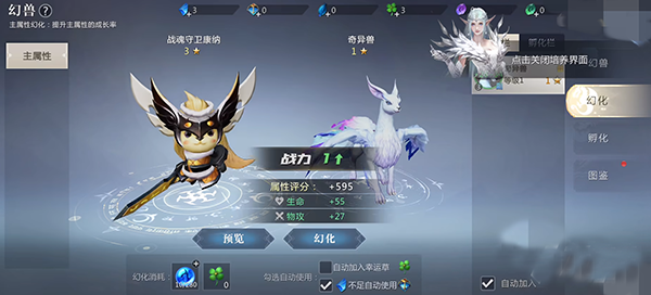 首先在玩家攻略第一章内容之后就会解锁这个重要的幻兽系统了,如图所示点击安装初始的幻兽战魂兽康纳,然后就可以让这个小东西上场战斗了,该宠物的能力就是增加生命和物攻能力,这个初始小东西非常的适合战士玩家初始使用。