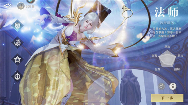 1、进入游戏在左侧可以选择职业,然后再选择性别,下一步。