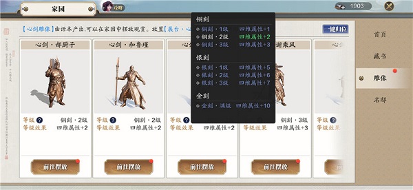 心剑雕像是摆放在家园的庭院里的,收集雕像和提升雕像等级都能增加功力。