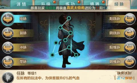 经脉玩法中各个经脉都会对侠客的属性提供极大的加成,然而经脉解锁需要侠客的练功等级提升到一定境界,因此经脉玩法是对侠客后期提升战力的主要来源。
