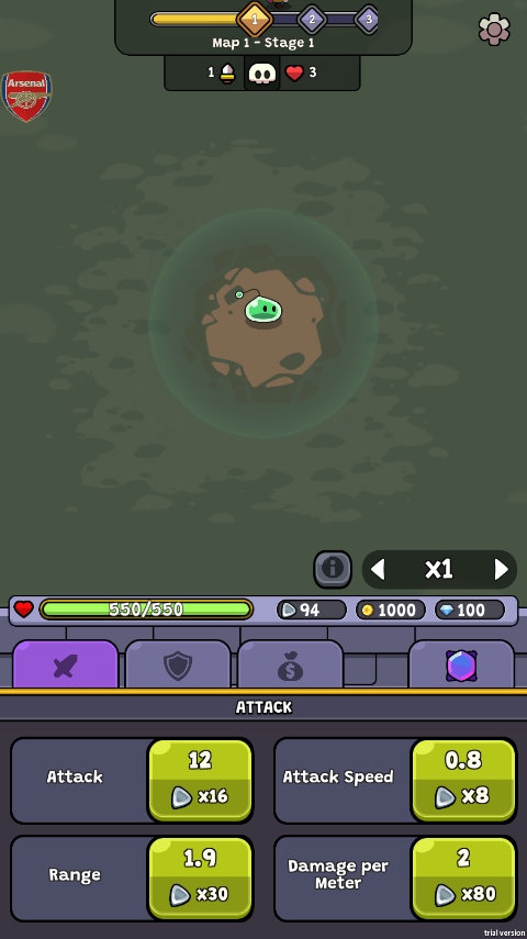 1、在本多多软件站下载安装该游戏的最新版,打开进入游戏点击绿色按钮可升级史莱姆的攻击力。