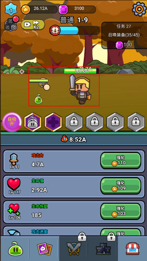 3、用金币强化属性,点击“自动”可以自动挂机攻击;