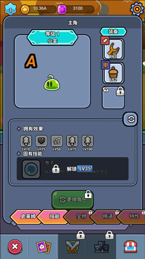 1、进入游戏,点击“主角”页面,可以升级史莱姆等级、装备和技能;