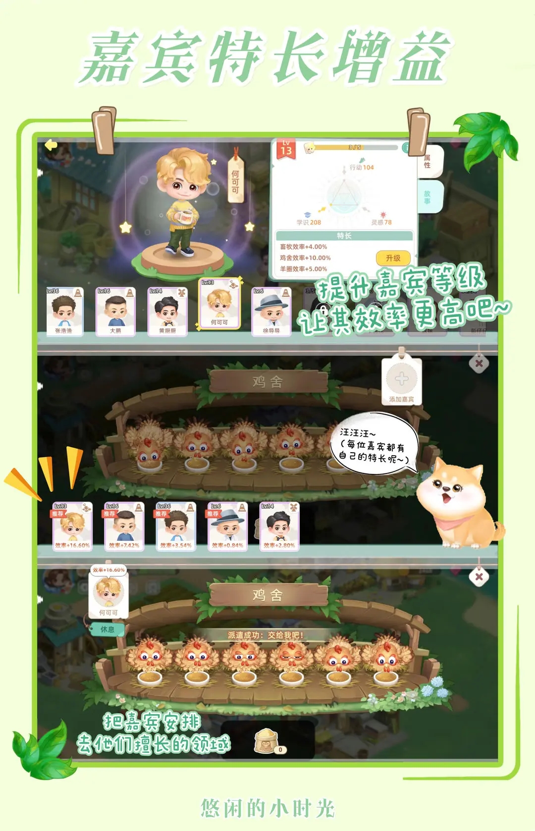 想提升效率就让嘉宾们助你一臂之力吧~获得相应嘉宾碎片,提升嘉宾的特长等级,让其效率提升吧!请安排合适的嘉宾去鸡舍、羊舍、工厂等,让他们的发光发热!