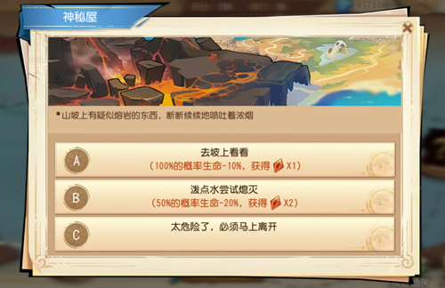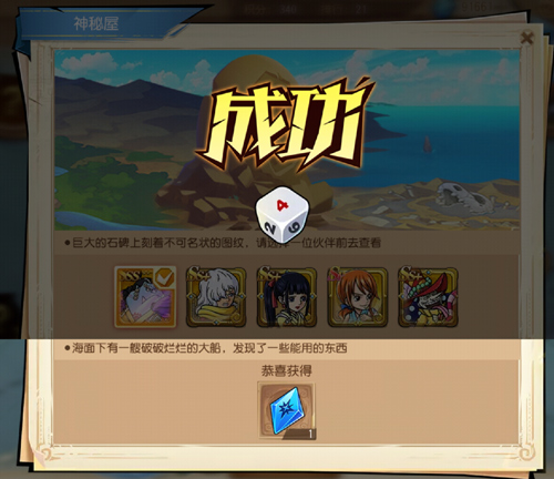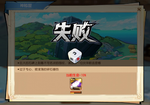 种类二:选择任意伙伴查看石碑,有可能成功,也有可能失败。掷骰子的点数小于等于3时,则判定为失败,失败后无法获得奖励,伙伴还会被造成伤害。