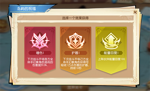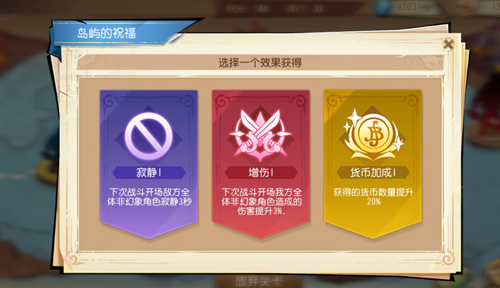 2、岛屿的祝福:一种是在常规战斗发生前的随机事件(如下图),通常在低级难度时,笔者推荐选择【货币加成】,以增加奖励获取额度。