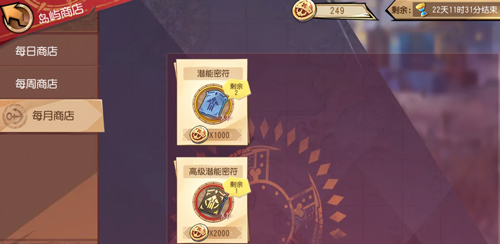 【每月商店】:可购买潜能秘符和高级潜能秘符,分别价值1000和2000潜能币,每月可分别换购2颗和1颗。