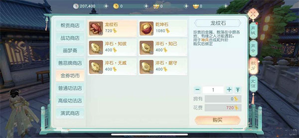 在商店中龙纹石的获取方式有两种,一个是通过战功商店使用12000点战功换取10颗龙纹石。另一种就是通过金券商店用720个金券换取15颗龙纹石,金券可以通过乱世奇谭来获得。此外玩家之间也可以交易龙纹石,具体的价格要看服务器的行情,目前来说龙纹石的价格大约在8000金币只有,直接换算成人民币就是800块钱,而且有可能没有货源。这种收集龙纹石的方法当然是不可取的,按照前面所说的武器16颗龙纹石,其他9件装备每件10颗龙纹石,一共需要106颗龙纹石,一颗800就是九万块钱,都能在三线城市付一个首付了。并且升阶的龙纹石还未算入其中,所以说还是得靠任务的形式来获取龙纹石。