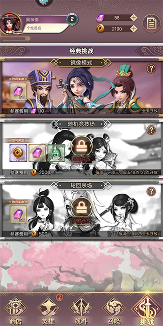 在游戏当中玩家可以去收集到各种有名的三国名将来帮助自己进行挑战,体验很有趣的玩法挑战。那么小编就给大家介绍下游戏里的挑战玩法吧!挑战玩法有三种:镜像模式、随机竞技场、轮回杀场。