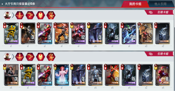 卡组引用可以高效率配卡。点击卡组编辑界面左侧的链接图标,列出在别的卡组中使用的英雄小卡组(如上图所示),可以直接引用,无需再一张张拖动编辑。