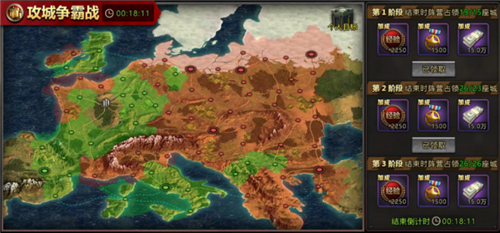 如果说积分争霸战是初期占城多的阵营有优势,那么攻城争霸战则是初期占城少的阵营有优势,这也是游戏策划时的一种平衡。国战开始后,系统会根据阵营当前占有的城池来定目标,总共三个阶段,每个阶段20分钟,都是根据阵营当前占有的城池数来定的目标,所以这场国战的精髓就是控制城池数量,不要一下子占有太多,那样后面的阶段会变得比较困难。如何控制占城数量?