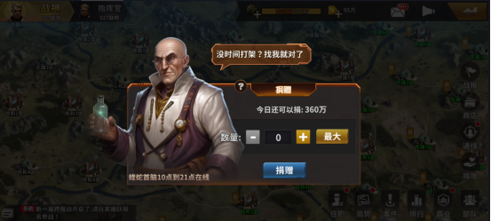 4、捐赠,捐赠是一个新增的玩法,将弹药捐赠给远征军,受到资助的远征军会随机前往敌方前线据点进行攻击,每日每人有最大捐赠上限,捐赠也可以快速获得一定的战功。