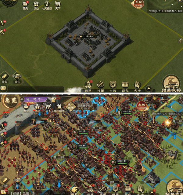 在地图上有县城、郡城、国都、关卡、玩家城池这几类。大秦帝国中最重要的玩法那便是攻城玩法需要玩家占领相邻城池的土地之后才能对该城池进行进攻。如同世族或同联盟可以相互“借地”,进行攻城。攻城主要必带兵种自然是离不开器械的投石车。攻城时根据各兵种不同的攻城值来对城防值进行伤害。
