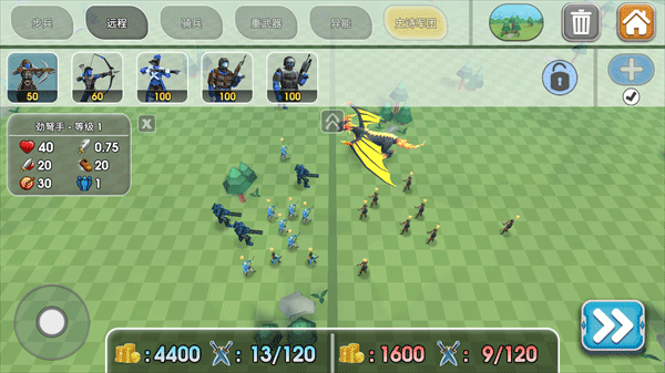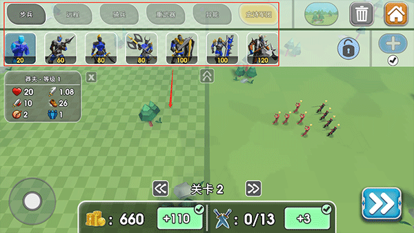 此外,玩家除了需要合理安排上阵的兵种外,还需要为士兵们进行升级后,升级后的士兵将会提升一定的血量、攻击力、移动速度等属性,等级越高其各属性也会越高,这样就能在战场上战胜更多敌人啦,喜欢这类游戏的玩家可以下载试试哦