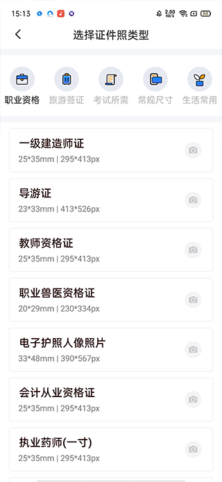 2、在这里提供了各种证件照类型如:职业资格、旅游签证、考试所需、常规尺寸、生活常用;