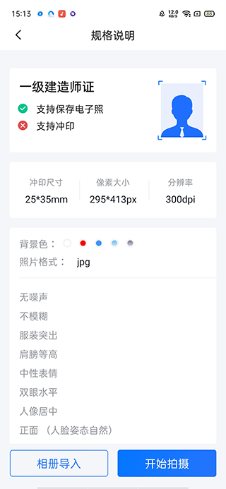 【多种背景色可选】证件照照相机一键修改照片背景(支持红底,蓝底,白底等),随意换背景【满足所有尺寸要求】证件照相机有齐全的证件照规格,支持身份证照、签证照,一寸照片二寸照片1寸2寸两寸照片等尺寸