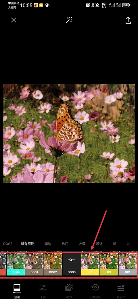 6、之后如果编辑新的照片时还想这种滤镜时,就可以直接在配方界面中点击添加的滤镜就可以啦